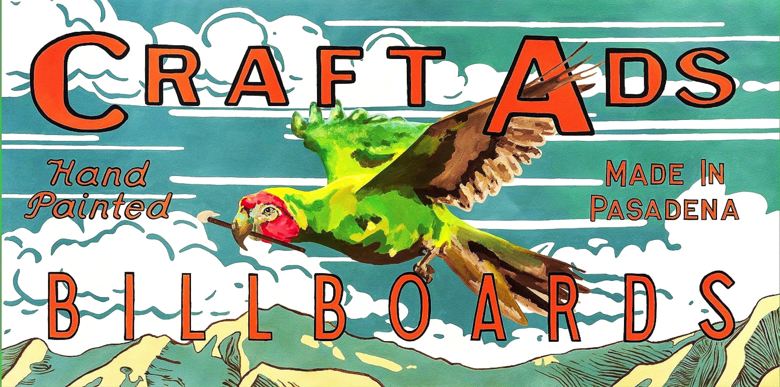 Our inaugural hand-painted advertisement is a true Craft Ads original. Highlighting the Pasadena mascot, an Amazon Red Crowned Parrot gracefully soars above the San Gabriel Mountains, clutching a paintbrush in its beak. Colors were strategically chosen to capture the local Pasadena community’s attention as it was our first mural to be displayed on a prominent billboard.